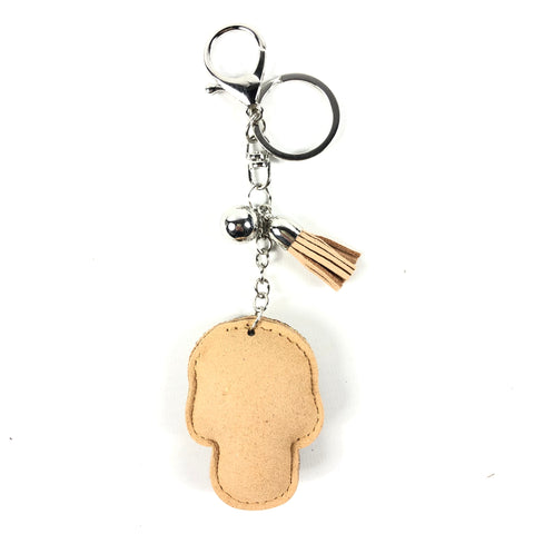 Luxe sleutelhanger van een doodskop / skull die aan de voorzijde is opgevuld met goudkleurige strass steentjes. De ogen mond en neus zijn aangebracht met zwarte strass steentjes. De achterzijde van de doodskop is van beige vilt. De doodskop is opgevuld en heeft een dikte van ongeveer 1,5 cm. De hanger zit bevestigt aan een zilverkleurig kettingtje met ring, clip, ballettje en een kwastje met beige leren franjes.