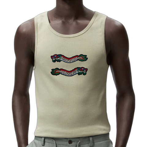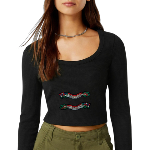 Een set van twee Chinese draak strijk patches. De draken zijn geborduurd met verschillende kleuren garen, de hoofdkleur en zijn rood en groen. De ene draak kijkt naar links, de andere naar rechts. Beide draken hebben een zwart dun vilten randje.